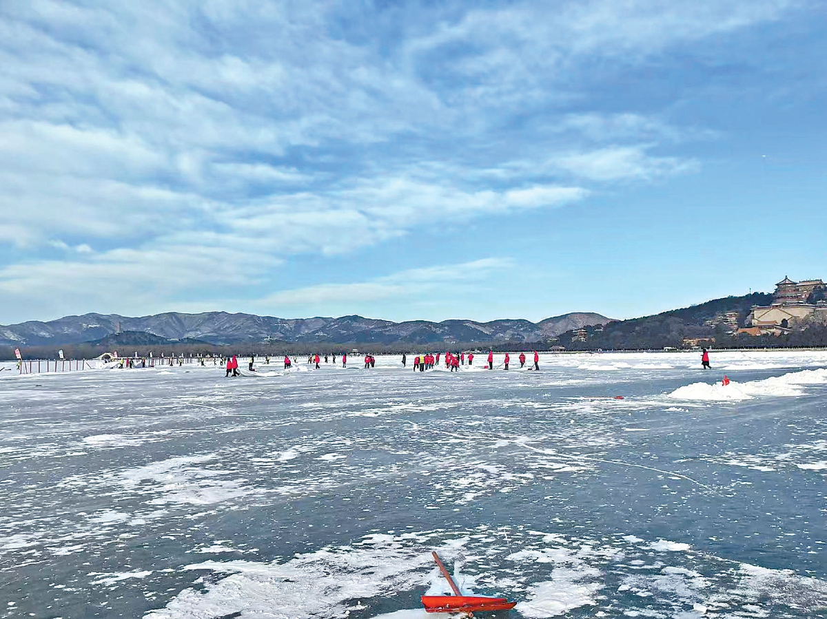 200餘名工作人員穿著醒目的紅色工裝,分散在白茫茫的冰麵上。他們幾人一組,先用雪鏟將積雪推到苫布上,再將雪堆拖向非遊客活動區域。朔風卷著碎雪從昆明湖上呼嘯而過,但大家幹得熱火朝天。
