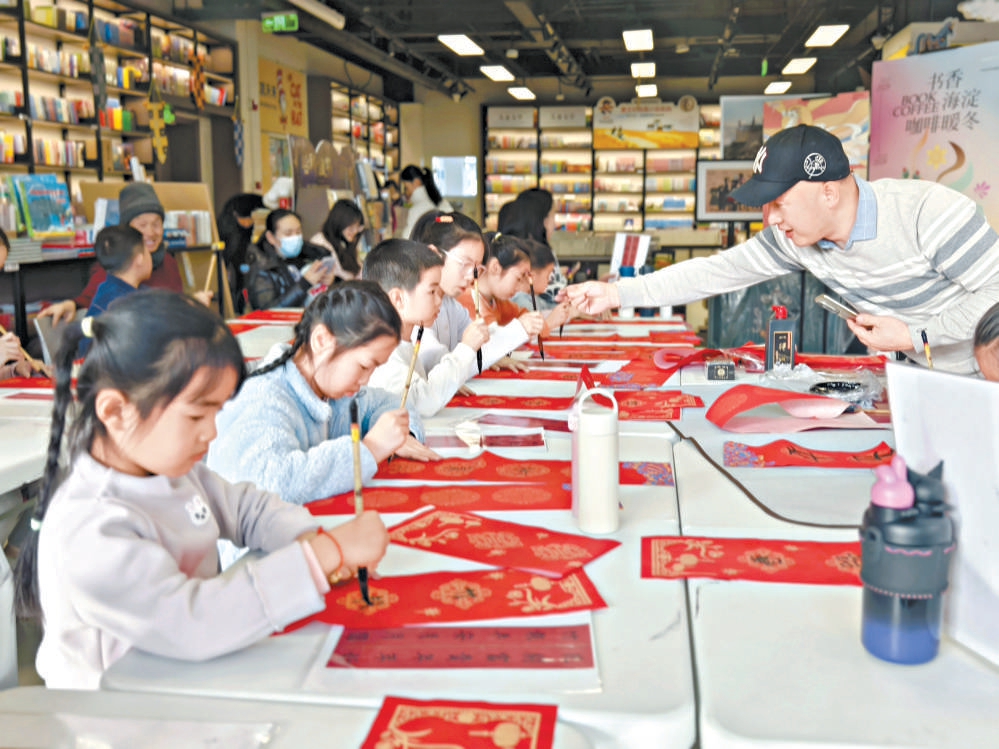 小朋友在中關村圖書大廈體驗寫春聯。