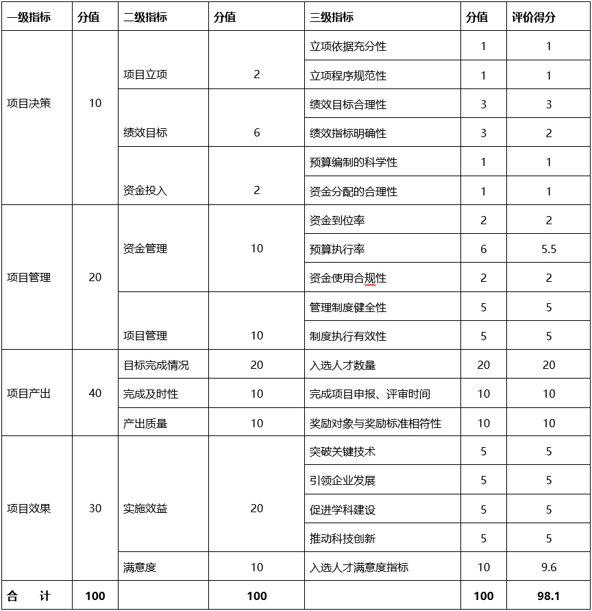 本項目決策依據充分,決策程序規範,組織機構健全,績效目標明確,管理規範,項目完成質量較好,在突破關鍵技術、引領企業發展、促進學科建設、推動科技創新等方麵發揮了積極作用,具有較好的經濟效益和社會效益。但是,部分績效目標設置的明確性和可衡量性有待完善,項目績效支撐資料有待加強。該項目績效評價得分為98.1分,綜合評價等級為"優秀"(詳見評分表)。