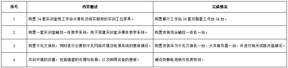 項目為2020年新增項目,目標為升級改造輕工分院影視後期製作實訓室,主要內容及完成情況見表1。截至2020年12月31日,該項目主要工作已完成,已投入教學供師生使用。