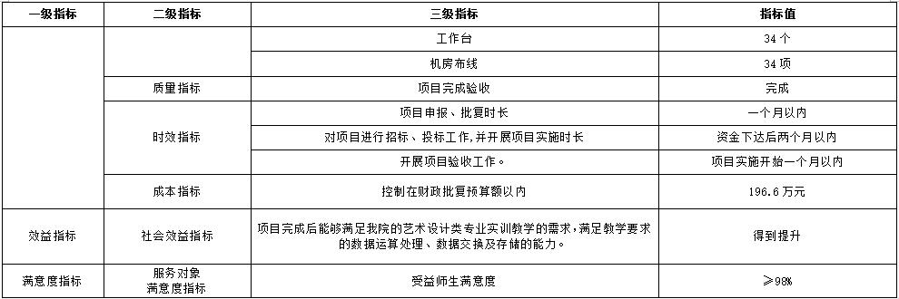 項目主要通過開展工作站購置、實訓室多媒體教學係統搭建、網絡係統更新、實訓環境改善等工作,實現後期製作剪輯實訓室的整體升級改造,滿足師生日常教學需求。項目績效目標圍繞項目內容設置,涵蓋工作內容、預期實現效果等,績效目標與項目內容相匹配。