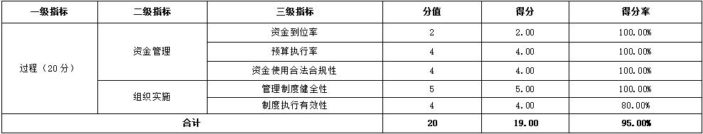 項目財務和業務管理製度健全,批複資金全額到位,資金執行率100%,資金使用合規。但項目過程管理仍存在合同要素約定不夠清晰、項目驗收不夠規範等問題。該指標分值20分,得分19分,得分率95%。評分見表5。