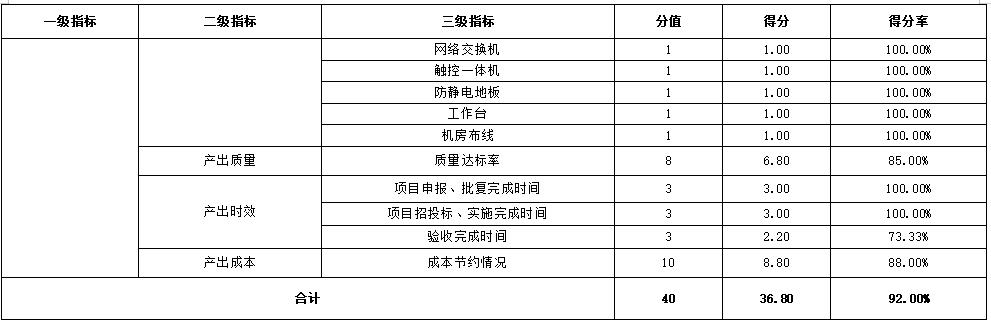 項目年度主要產出按照預期目標完成,各項產出質量基本達標,項目實施過程中采取了一定成本節約措施,但部分配套設備質量不如預期,采購物資到貨後未及時開展驗收入庫,存在質量風險。該指標分值40分,得分36.8分,得分率92%,評分見表6。