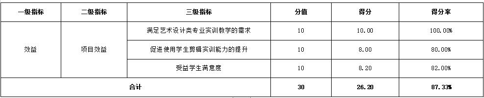 通過項目實施,為藝術設計類專業實訓教學提供了有力保障,學生能夠使用更符合實訓需求的軟硬件設施開展後期製作剪輯實訓,有助於學生實踐能力的提升,強化教學質量,為培養更高水平技能人才提供了硬件和軟件保障,具有較強的社會效益。效益指標總分30分,得分26.2分,得分率87.33%。得分情況見表8。