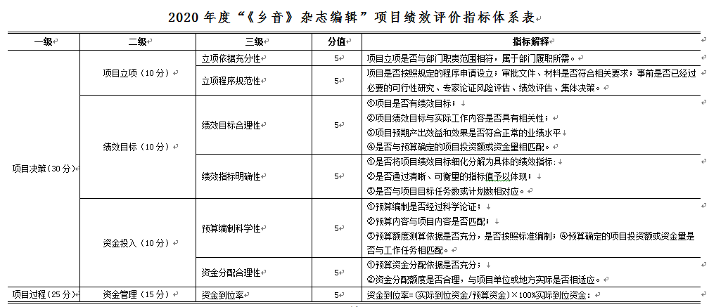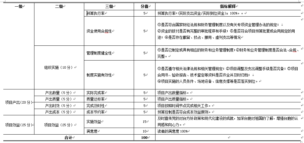 績效評價指標體係主要包括項目決策、項目過程、項目產出、項目效益4個方麵,滿分100分。一是決策指標(30分),主要評價項目立項、績效目標、資金投入等內容;二是過程指標(25分),主要評價資金管理和組織實施等內容;三是產出指標(20分),主要評價項目產出數量、產出質量、產出時效和產出成本等內容;四是效益指標(25分),主要評價實施效益和滿意度等內容。具體內容見下表: