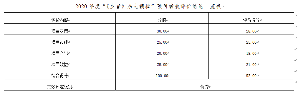 北京市台灣同胞聯誼會2020年度"《鄉音》雜誌編輯"項目,項目績效評價綜合得分92分,其中項目決策28分、項目過程25分、項目產出18分,項目效益21分,績效評定結論為"優秀"。
