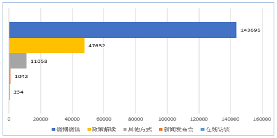 回應公眾關注熱點或重大輿情16188次。在回應解讀的渠道方式上,舉辦新聞發布會1042次(主要負責同誌參加新聞發布會次數557次);政府網站在線訪談234次(主要負責同誌參加政府網站在線訪談89次);政策解讀稿件發布47652篇;微博微信回應事件143695次;其他方式回應事件11058次。