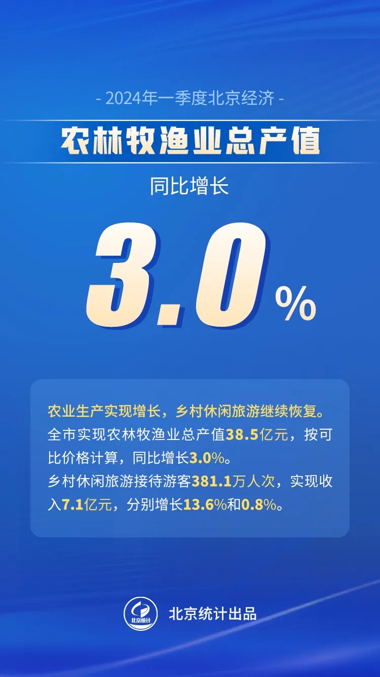 一季度,全市實現農林牧漁業總產值38.5億元,按可比價格計算,同比增長3.0%。其中,實現農業(種植業)產值15.2億元,增長2.7%,穩步推進春耕備耕,冬小麥苗情總體良好,主要糧食作物種植意向持續提升,瓜果類播種麵積和產量分別增長9.7%和13.7%;受禽蛋生產帶動,實現牧業產值10.3億元,增長10.7%。鄉村休閑旅遊接待遊客381.1萬人次,實現收入7.1億元,分別增長13.6%和0.8%。