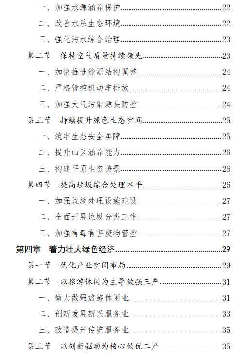 ——生態環境品質大幅提升。生產方式和生活方式更加綠色、低碳化,在全域範圍內劃定“兩線三區”,統籌生態保護和城鄉建設的空間管控。空氣質量繼續保持全市領先,主要汙染物排放總量持續削減,PM2.5年均濃度降幅達到市級要求。水質環境進一步提升,河湖水質基本達到Ⅲ類標準以上,重要河湖水功能區水質達標率85%,用水總量達到市級要求。能源結構更加優化,能源消費總量達到市級要求,新能源和可再生能源占全區能源消耗比重達到40%。生態空間進一步擴大,森林覆蓋率達到58.03%,土壤清潔度進一步提高。