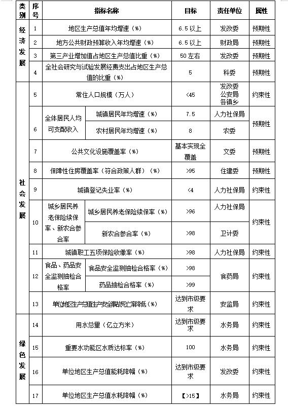 1.區域經濟保持持續穩定增長。地區生產總值年均增長6.5%以上,實現比2010年翻一番。發展質量穩步提升,地方公共財政預算收入年均增長6.5%以上。區域經濟結構調整取得重要進展,實現一產優化發展、二產升級發展、三產快速發展,第三產業增加值占地區生產總值比重達到50%左右。投資效益明顯上升,五年累計完成全社會固定資產投資750億元。商貿、旅遊對經濟增長貢獻繼續提升,社會消費品零售額年均增長8%,實現旅遊綜合收入85億元。