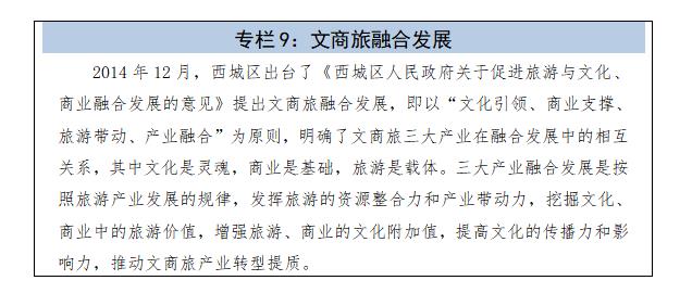 完善服務經濟布局。堅持功能街區集約發展模式,積極促進服務經濟布局與功能街區有機結合,實現融合發展。各功能街區在全麵完成既定建設和發展目標的基礎上,積極探索轉型發展新路徑。鞏固金融業發展基礎,充分發揮金融體係優勢資源作用,強化金融街品牌輻射帶動作用,提高全球配置資源能力和控製影響力。促進中關村西城園產業鏈條高端環節優化升級,保持創新活力。全麵完成北展地區疏解任務,推動科技、金融、創新融合發展。打造西單商業區高端時尚品牌,強化業態、環境和服務提升。深入推進什刹海阜景街、大柵欄琉璃廠地區特色商業旅遊和文化創意產業發展。促進天橋演藝區資源有效整合,不斷提高區域文化魅力和影響力。推動馬連道地區業態提升,建設茶為特色、多元發展的文化創意街區。