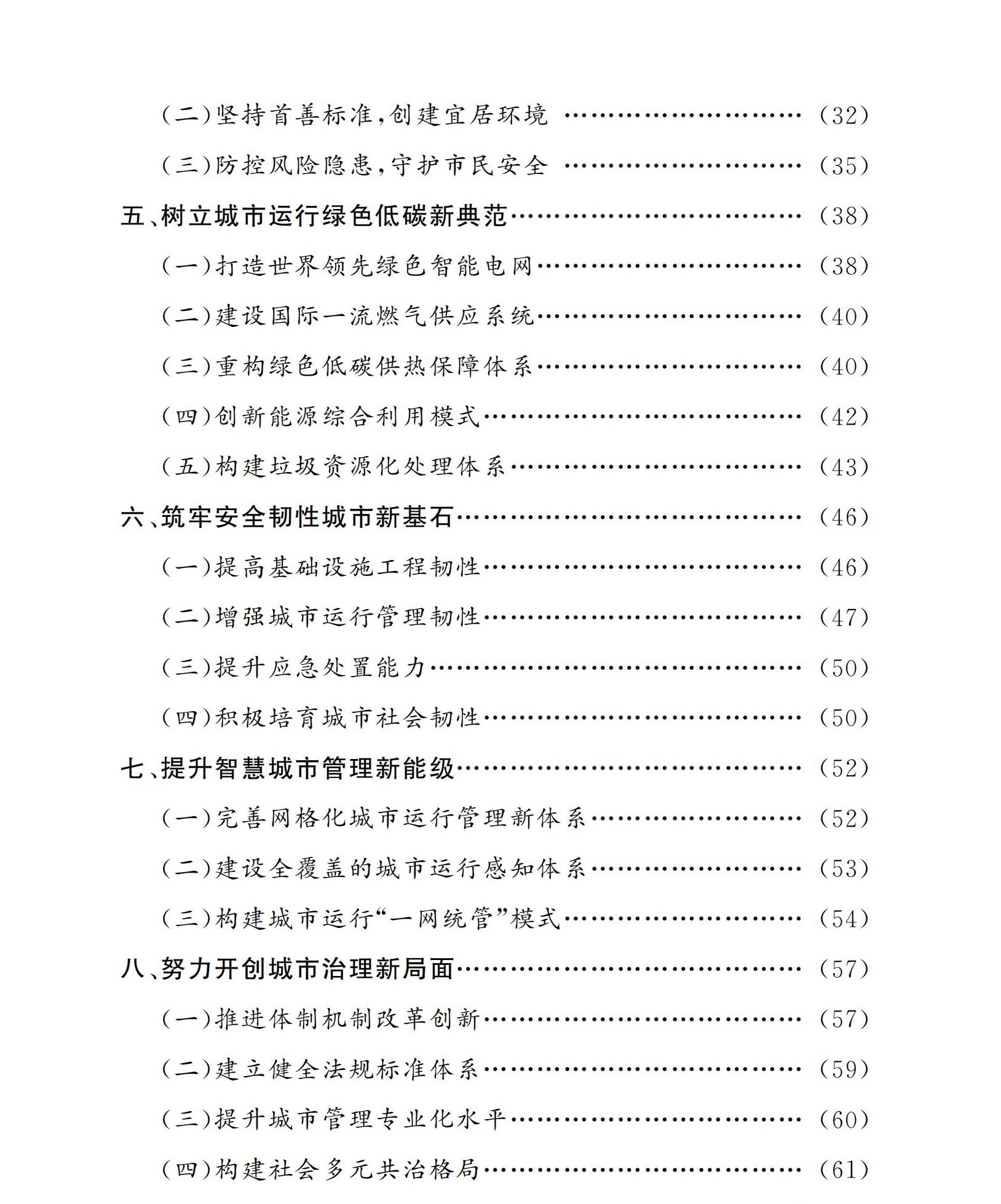 城市運行保障體係更加安全、高效、清潔、低碳,服務保障能力顯著提升。補齊市政基礎設施能力短板,並形成一定裕度。外受電通道輸電能力達到4300萬千瓦,本地發電裝機容量達到1533萬千瓦(含應急備用電源),城鎮地區供熱麵積達到10.5億平方米,生活垃圾焚燒和生化處理能力達到3.1萬噸/日以上(焚燒處理能力達到2.2萬噸/日以上、生化處理能力達到0.9萬噸/日以上),全市電動汽車充電樁累計建成量達到70萬個。生產生活方式綠色低碳轉型全麵推進,電能消費占終端能源消費比重力爭達到29%,外調綠色電量力爭達到300億千瓦時,天然氣消費量控製在200億立方米/年左右,生活垃圾回收利用率達到37.5%以上,實現原生生活垃圾“零填埋”。