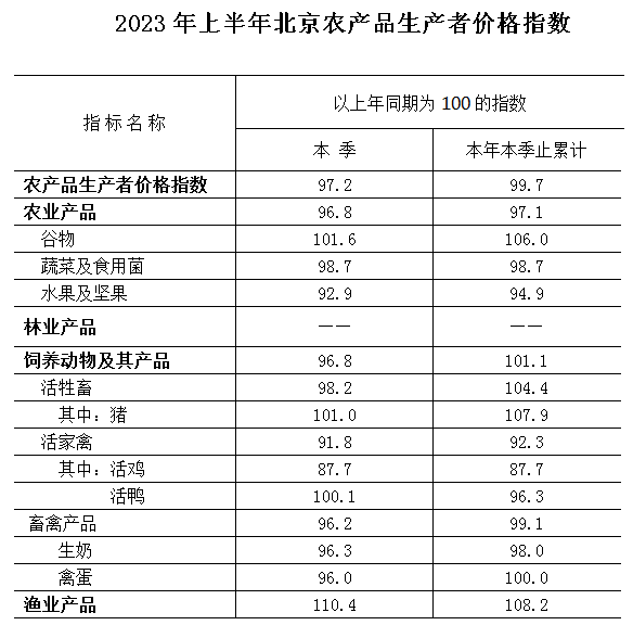 上半年,北京農產品生產者價格總指數為99.7,價格同比下降0.3%。農、牧、漁三大類農產品價格“1降2升”,指數分別為97.1、101.1和108.2。