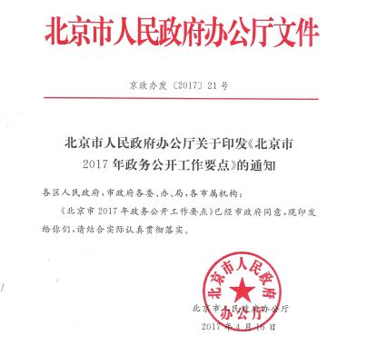 2017年,北京市深入學習貫徹黨的十九大精神,以習近平新時代中國特色社會主義思想為指引,認真落實黨中央、國務院關於全麵推進政務公開工作的係列部署,嚴格履行《中華人民共和國政府信息公開條例》法定義務,圍繞市委市政府中心工作,全麵推進決策、執行、管理、服務、結果公開(以下統稱"五公開"),加強政策解讀、擴大公眾參與,充分發揮公開促落實、促規範、促服務的作用。
