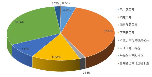 已答複的34226件申請中:"屬於已主動公開範圍"1563件,占總數的4.56%;"同意公開"12949件,占總數的37.83%;"同意部分公開"642件,占總數的1.88%;