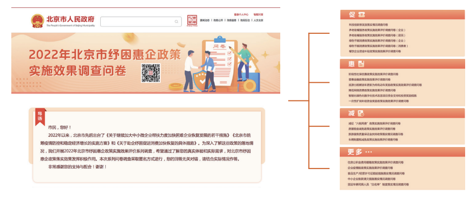 市政府門戶網站和微信公眾號上線“2022年北京市紓困惠企政策實施效果調查問卷”專題,開展社會評議。政府信息公開法定要求納入績效考核指標和第三方評估體係,年度內未發生需責任追究情形。