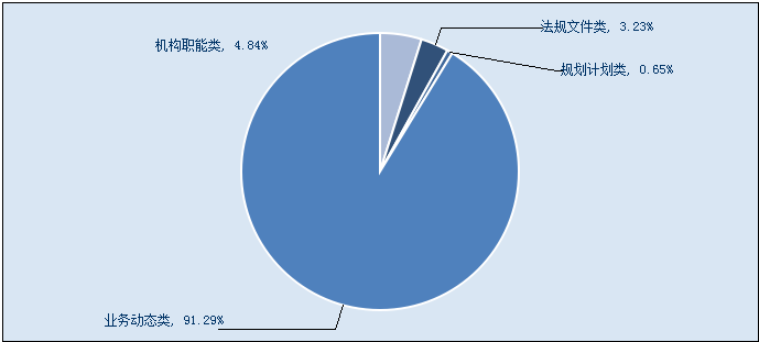 在主動公開的信息中,2015年新增機構職能類信息15條,占全年主動公開信息的比例為4.84%;法規文件類信息10條,占全年主動公開信息的比例為3.23%;規劃計劃類信息2條,占全年主動公開信息的比例為0.65%;業務動態類信息283條,包括統計信息和部門工作動態等內容,占總體的比例為91.28%。