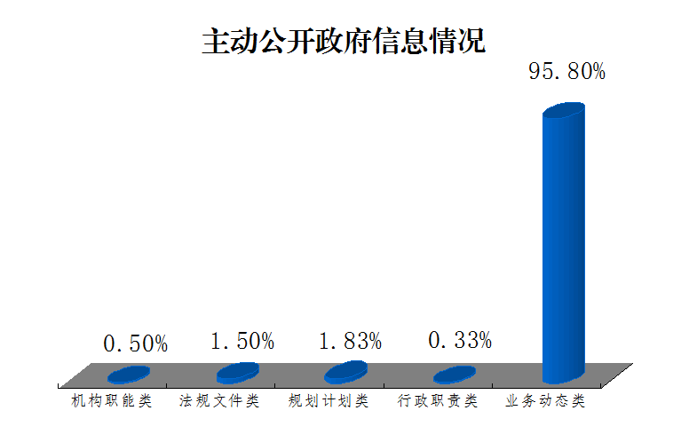 2016年,以政府網站為主要渠道,通過“政府信息公開專欄”公開政府信息共計601條,其中機構職能類3條,占0.5%;法規文件類9條,占1.5%;規劃計劃類11條,占1.83%;行政職責類2條,占0.33%;業務動態類576條,占95.8%。