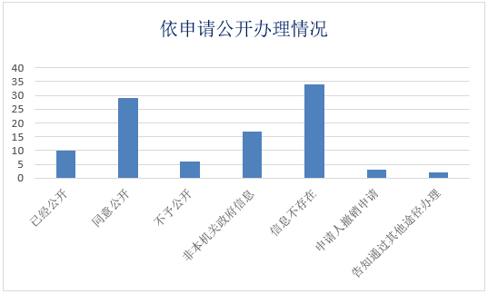 2018年共受理60人次申請公開政府信息事項74項,其中:當麵申請14人次,信函申請38人次,電子郵件申請12人次,網頁申請10人次,均已按規定時限答複完畢。從申請的政府信息內容看,政策類信息14項,占受理總數的18.9%;統計類信息18項,占受理總數的24.3%;檔案類信息5項,占受理總數的6.8%;業務工作類信息37項,占受理總數的50%。