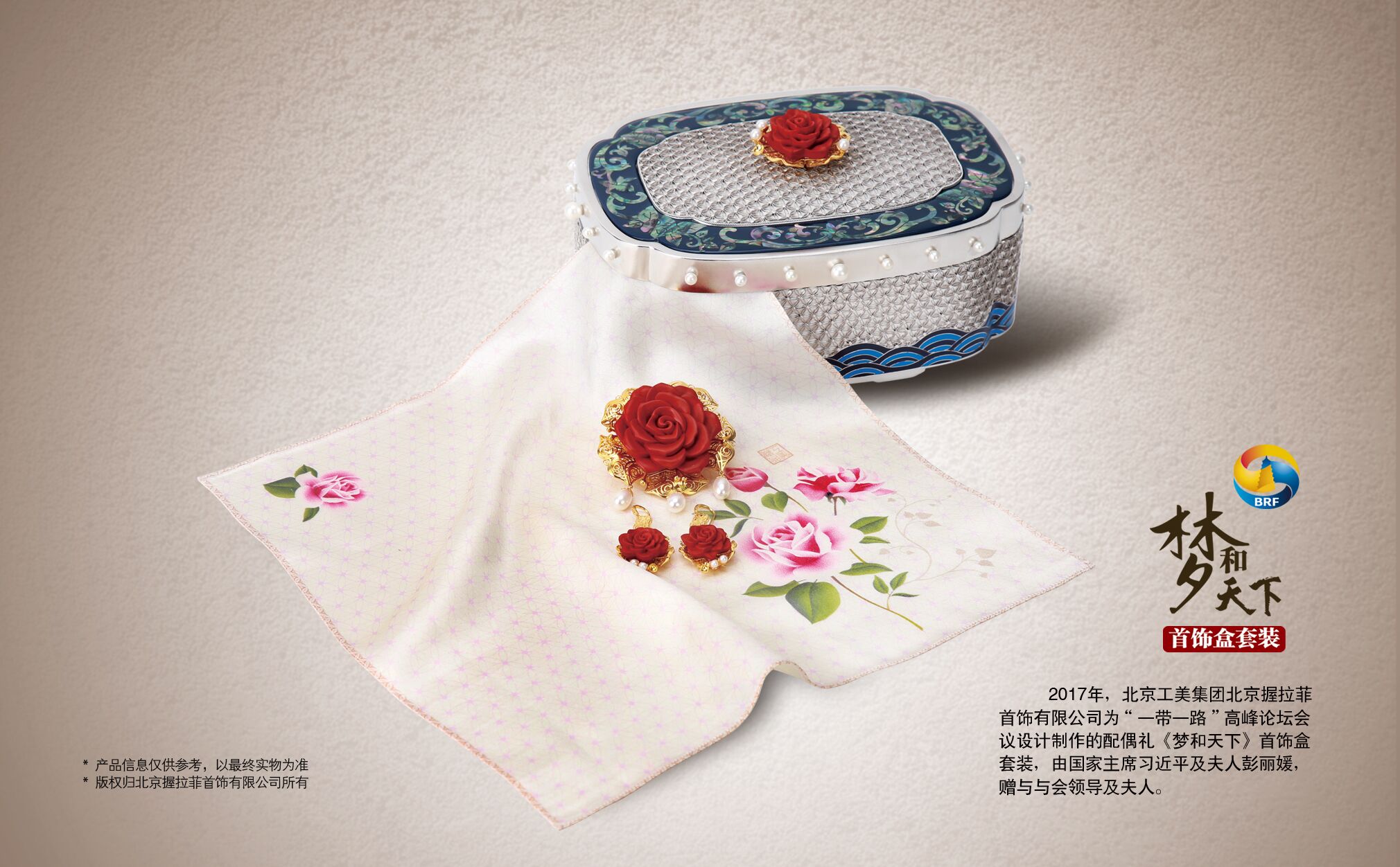 “一帶一路”國禮“夢和天下”首飾盒套裝工藝極為複雜,雕漆、花絲鑲嵌、螺鈿、琺琅等工藝相互融合,顯得低調華麗。盒型取自中式花窗,飾以月季紋飾和琺琅彩海水紋,再點綴雕漆月季花鈕,富有中國韻味。首飾盒套裝取意祥和如意、和諧共生,月季是北京的代表花卉,既顯吉祥端莊,又獨具京味兒文化。首飾盒套裝采用足銀及18k金材質,分別鑲嵌傳統工藝中的螺鈿、珍珠、雕漆。以首飾盒、耳飾、胸針合為一套。