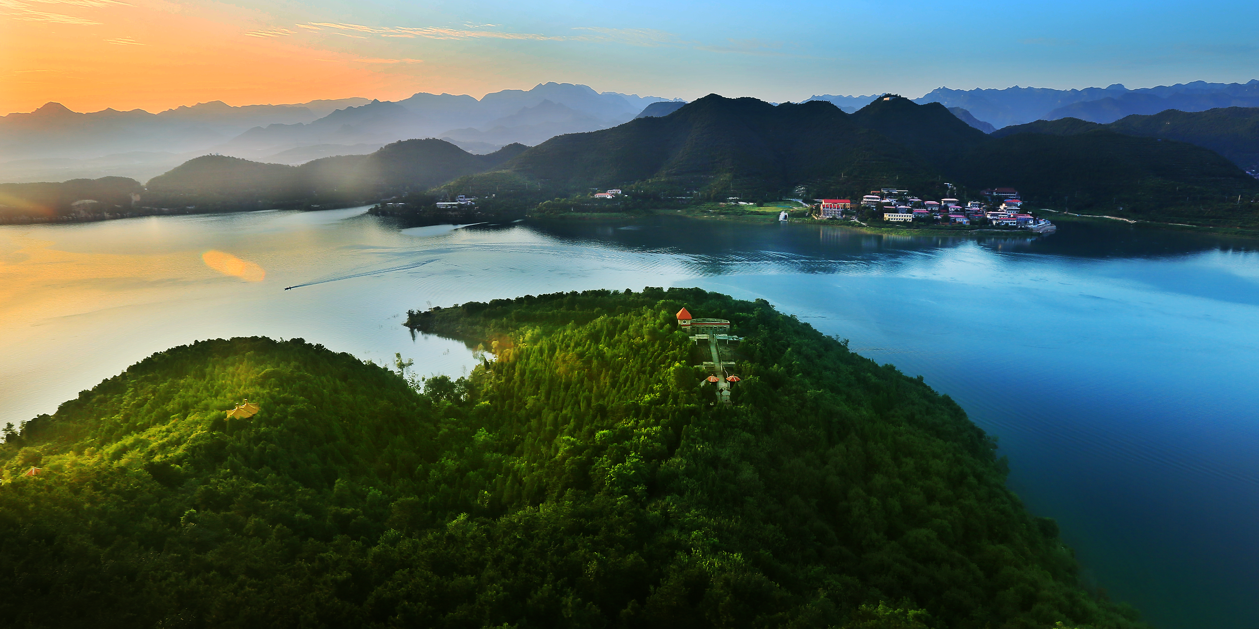 “碧波金海,清涼世界”。金海湖景區位於金海湖鎮,是國家4A級景區,擁有6.5平方公裏水域麵積,是北京最大的綜合性休閑娛樂水域,被評為市級風景名勝區和市級旅遊度假區。金海湖三麵環山,風景秀麗,有湖光塔、金花公主墓、望海亭、鋸齒崖等數十處景觀,融自然與人文於一體,現有遊船、快艇、帆船等水上運動休閑項目,是開展水上運動、娛樂項目的理想之所。