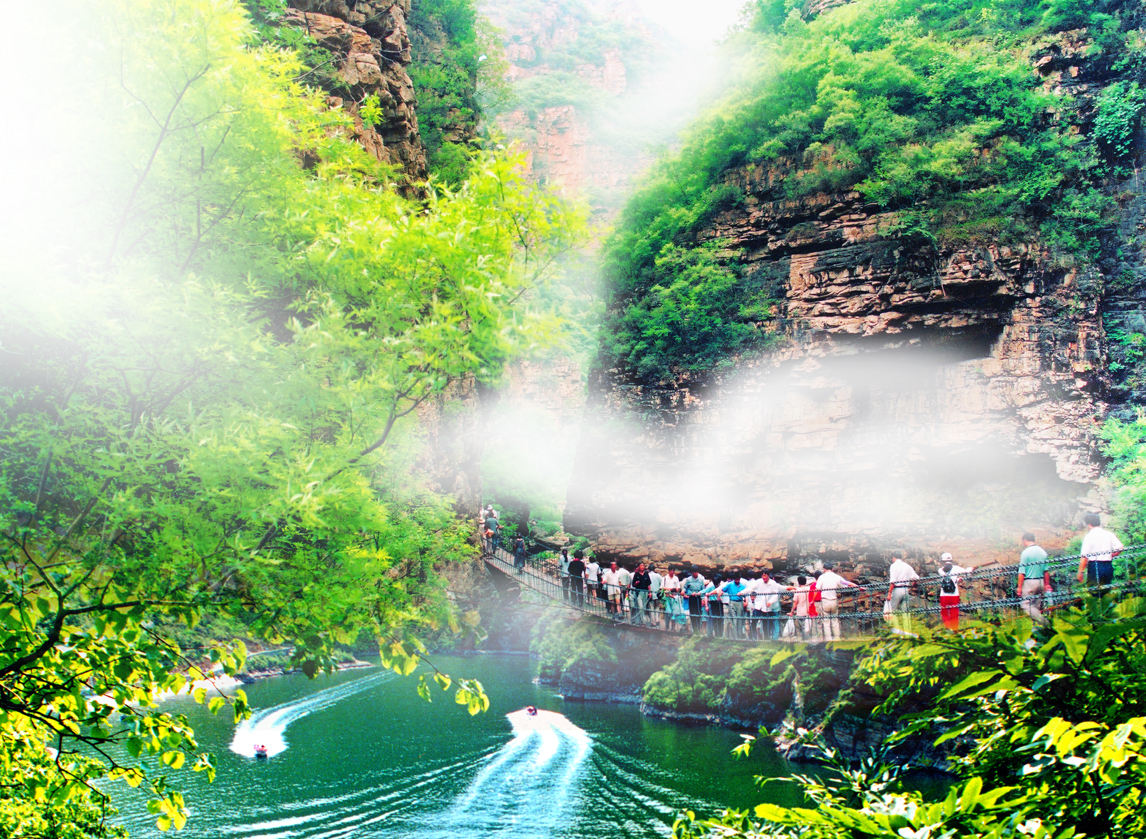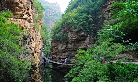 峽穀內奇峰崢嶸,如利劍插天或似翠屏橫沉,忽高忽低,錯落成趣,更有山泉匯聚成潭,五眼潭水如五封明鏡鑲嵌穀中,人稱“京東奇景”,建於“萬丈崖”峭壁之上的玻璃棧道窄細悠長,行走其間,如淩雲漫步,更為這奇景增添驚險趣味。