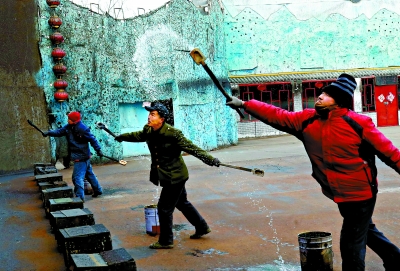 為了保證演出效果,鐵花匠人每天都要訓練,在冬日裏用水模擬鐵水進行練習以增強技藝。