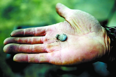 ▼鐵花匠人直接擊發鐵花的手掌布滿了老繭和燙傷後留下的傷痕。