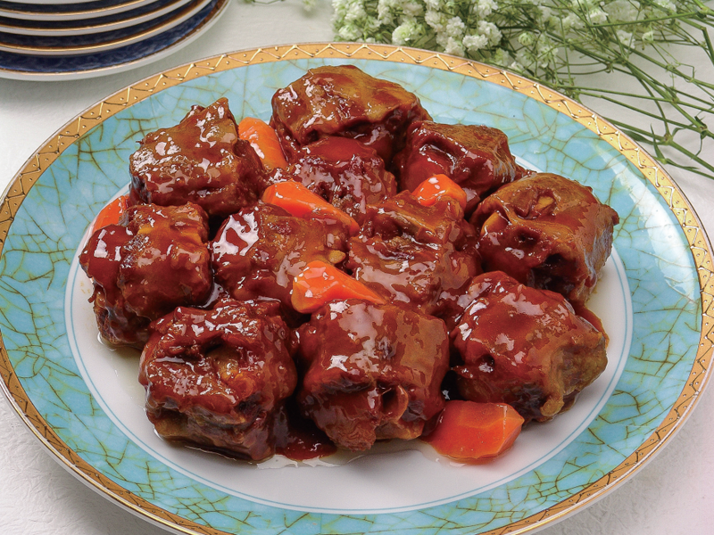 紅燒牛尾色澤紅潤、鹹香味厚、質地軟爛。看似成形不離骨,筷子一夾肉分離