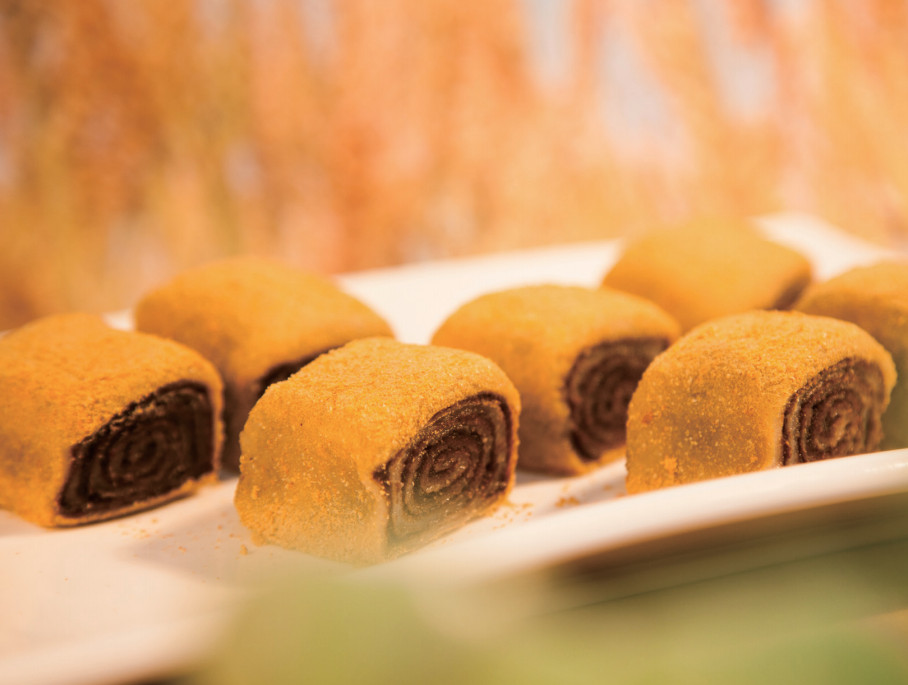 驢打滾外層粘滿豆麵,呈金黃色,豆香餡甜,入口綿軟,別具風味