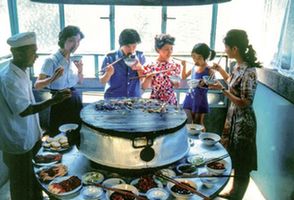 烤肉季飯莊成立於清朝道光28年。1848),距今已有160年的曆史,位於風景秀麗的什刹海畔,是京城知名的老字號,主營北京烤肉和清真炒菜,有“南宛北季”的美譽。而“北季”則是位於西城區什刹海銀錠橋畔的烤肉季。由於烤肉季飯莊地處曆史悠久的什刹海風景區、旅遊區,又是老字號,裝修風格具有濃鬱的民族文化風韻,古色古香、雕梁畫棟的小樓,紅柱綠瓦配以漢白玉欄杆,抱柱上是著名書畫家肖勞先生題的對聯:“畫樓醉看粼粼水,炙味香飄淡淡煙。烤肉季烤肉技藝上百年來,烤肉季烤肉有幾種獨特的吃法,不同形式,不同風味。惟其“武”是說過去的“爺們兒們”吃烤肉時人人手執尺二長的“六道木”,在烤肉炙子旁,一隻腳蹬長條板凳上,自將醃漬好的肉,攤在鬆香繚繞的烤肉炙子上翻而炙熟。[詳情]
