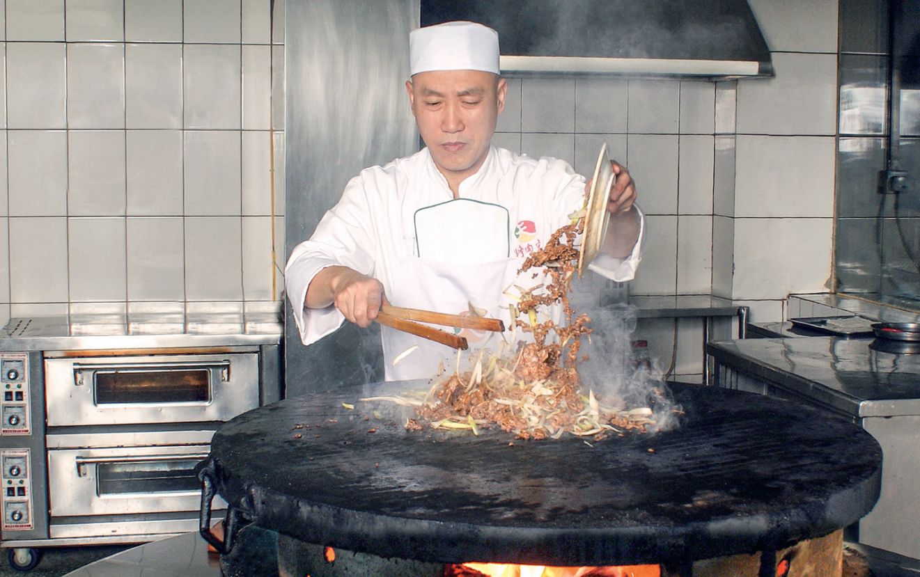 烤肉宛第七代傳承人萬春生在製作烤牛肉