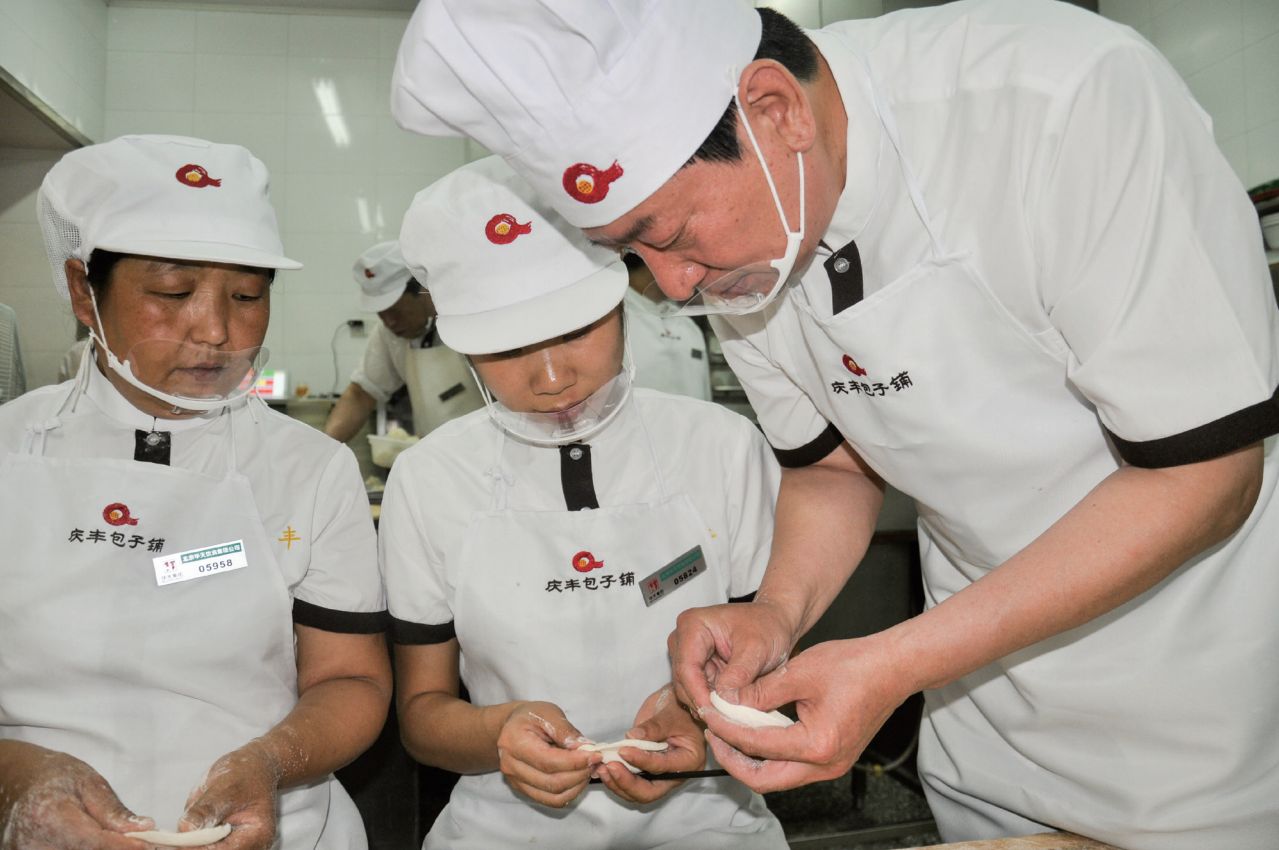 慶豐包子第三代技藝傳承人常金生(右一)傳授技藝
