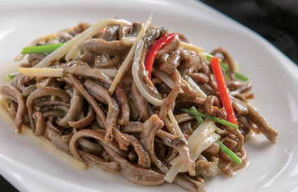曲園酒樓的酸辣肚尖,按照店裏的要求,每天的銷售量隻有區區30份,這可著實讓不少準備大快朵頤的人士提前預訂,因為來得稍晚一點兒,就要與之“失之交臂”。之所以限量30份,一是因為選料之精,4頭豬的豬肚僅能選出一盤酸辣肚尖的用料,而且肚尖要鮮,必須當日進貨當日售,方能保證其獨有的脆嫩口感。其二,這道酸辣肚尖對火候要求極高,欠火不熟,過火發艮,講究斷生即好,吃的就是脆勁兒。要烹製好這道酸辣肚尖,那必須是有一二十年功力的大廚。在名廚雲集的曲園酒樓,也隻有兩位師傅專門負責烹製此菜。曲園酒樓的酸辣肚尖製作頗為精細:必須選用鮮嫩肚尖,花刀切成麥穗狀,然後用湖南鮮辣椒,蔥、薑、蒜以及湖南泡菜炒製鍋底,鍋中散發出香味後,放入肚尖,加入10多種天然調料,炒得恰好時出鍋方可。這道菜也秉承了老字號湘菜特有的酸辣口感。品上一口,酸辣的感覺縈繞於唇齒之間,味蕾得到充分享受,令人難忘。