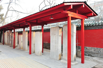 孔廟規模北京孔廟規模宏偉,占地廣闊,約2.38公頃,古建築麵積約有7400平方米,現有房屋286間,前後共三進院落,中軸線上依序為先師門、大成門、大成殿、崇聖門、崇聖祠五座建築。大成門外東有碑亭、宰牲亭、井亭、神廚;西有碑亭、致齋所、神庫、並有持敬門與國子監相通。據《國子監誌》記載,致齋所和宰牲所之南原有更衣亭和更房各一間。