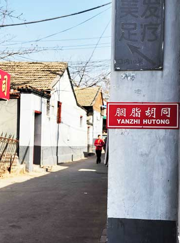 胭脂胡同原名胭脂巷,全長100米,寬約5米。胭脂胡同北口開在百順胡同,南口開在兩廣路上。胡同呈南北方向,其中部有東壁營與西壁營從中穿過。現殘存長僅有三四十米,胡同雖小,但常被列入八大胡同之中。在這幾個胡同裏胭脂胡同最短,但一等妓院有十多家。此地曾有店鋪製售胭脂粉,主供“八大胡同”煙花女施用,故名胭脂胡同。