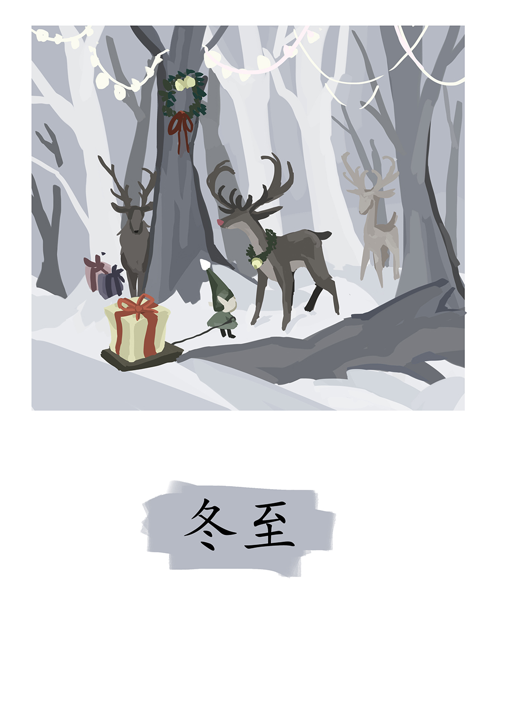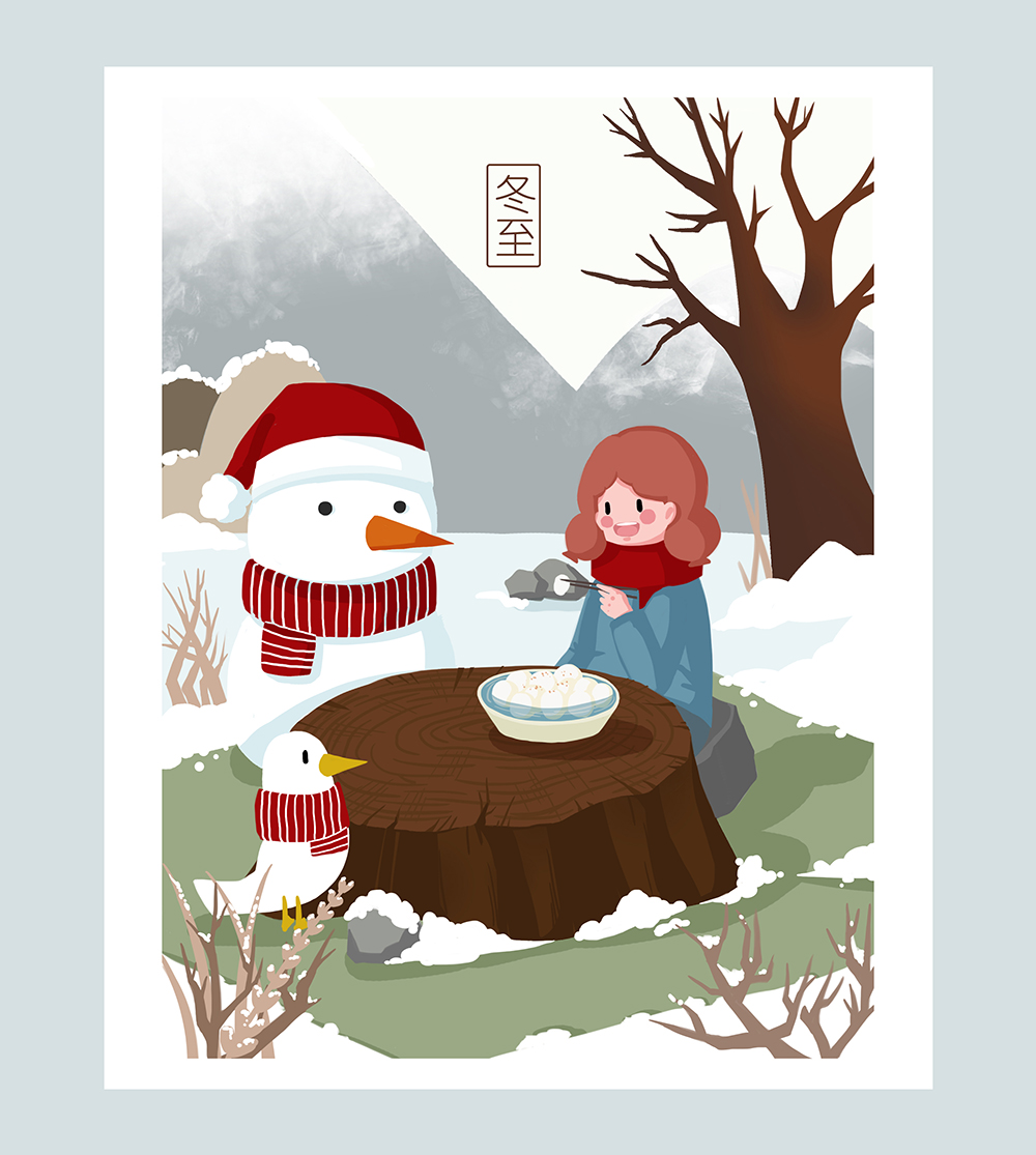 冬至,又稱日南至、冬節、亞歲等,兼具自然與人文兩大內涵,既是二十四節氣中一個重要的節氣,也是中國民間的傳統祭祖節日。冬至是四時八節之一,被視為冬季的大節日,在古代民間有“冬至大如年”的講法。冬至習俗因地域不同而又存在著習俗內容或細節上的差異。在中國南方地區,有冬至祭祖、宴飲的習俗。在中國北方地區,每年冬至日有吃餃子的習俗。冬至是“二十四節氣”之第22個節氣,鬥指子,太陽黃經達270°,於每年公曆12月21-23日交節。(作者:畫畫的路子)