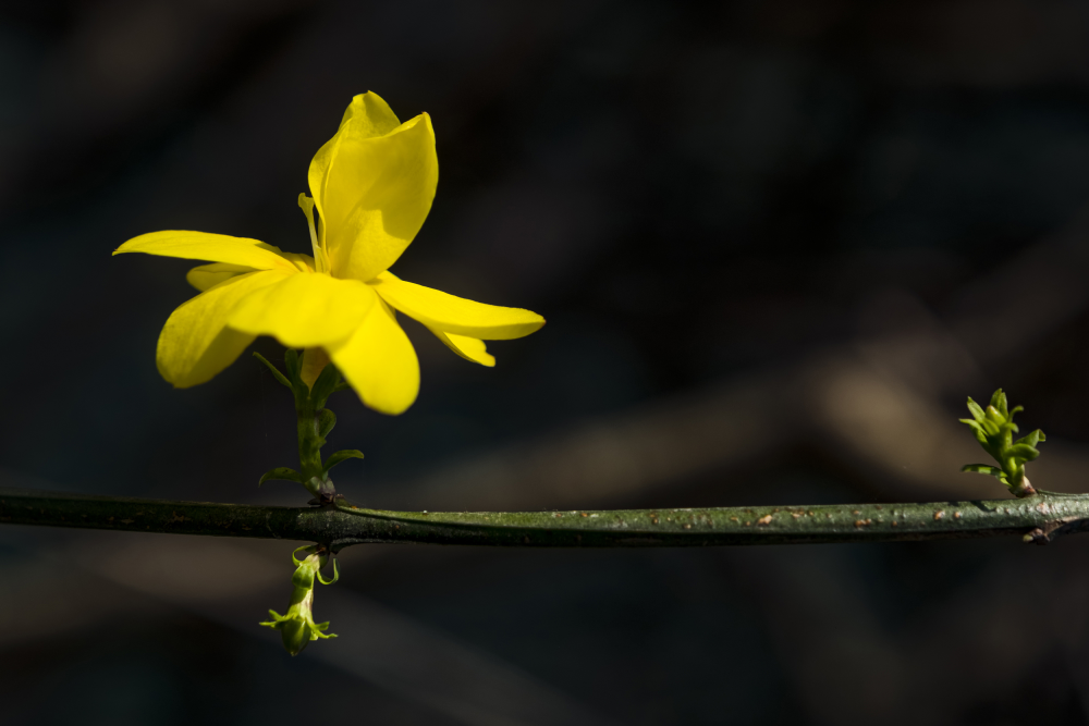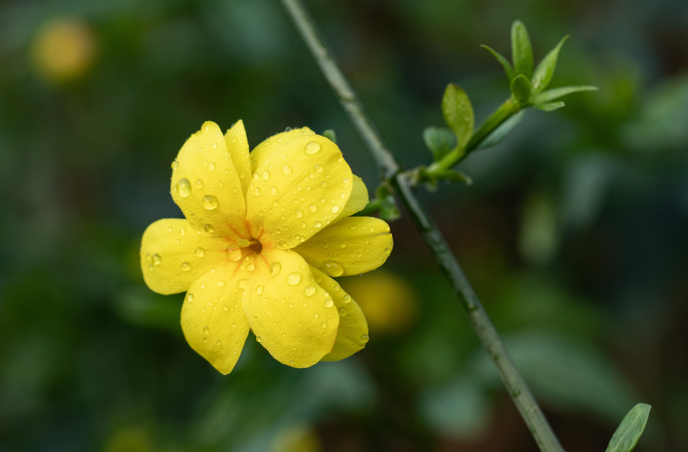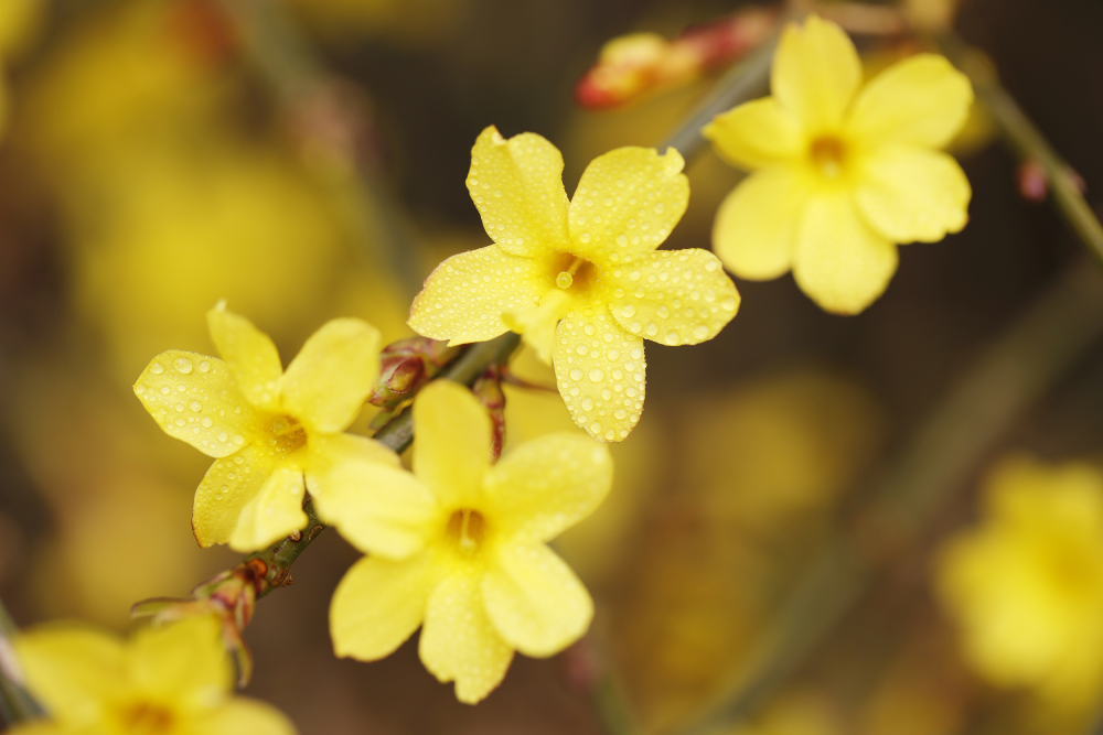 迎春花在早春開花,先花後葉,花色金黃。因為其花期較早,開花後即迎來百花齊放的春天而得名。