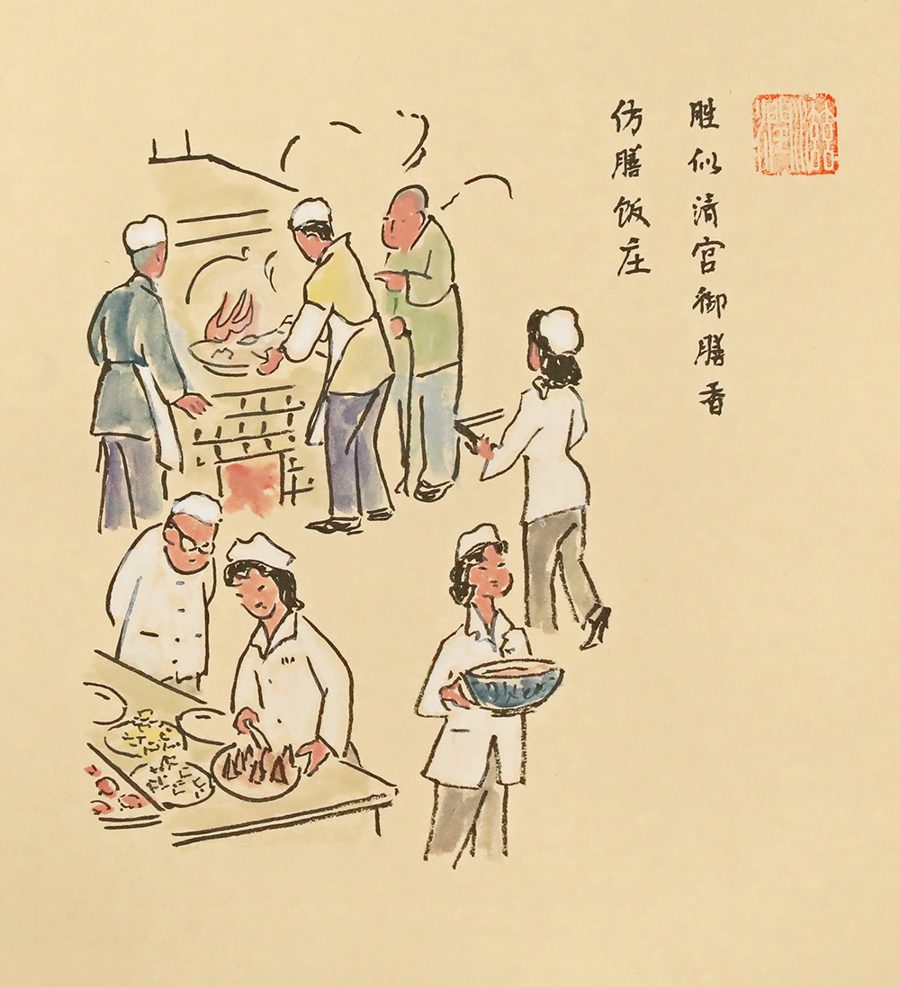 仿膳飯莊位於北海公園,1925年創辦,是京城有名的宮廷菜館,北京市旅遊局定點涉外餐館,特級飯莊,人們一般稱之為仿膳兒。仿膳飯莊前身是“仿膳茶莊”,主要經營宮廷糕點小吃,以肉末燒餅、小窩頭、豌豆黃最為有名。1956年改為飯莊,經營宮廷菜肴,以“滿漢全席”馳名中外。(作者:李濱聲、陳惠展)