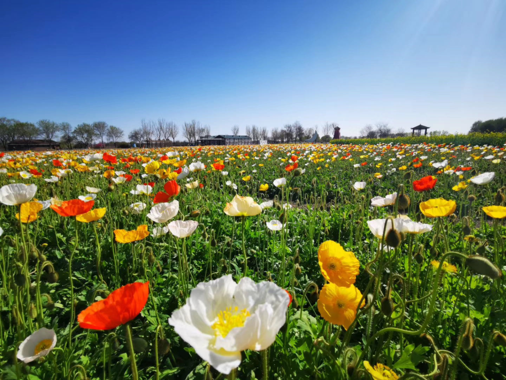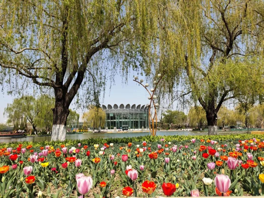 世界花卉大觀園。道路兩側櫻花、連翹、碧桃數十種觀賞性樹種,還有紫花地丁、二月蘭等野生地被花卉正值觀賞期。