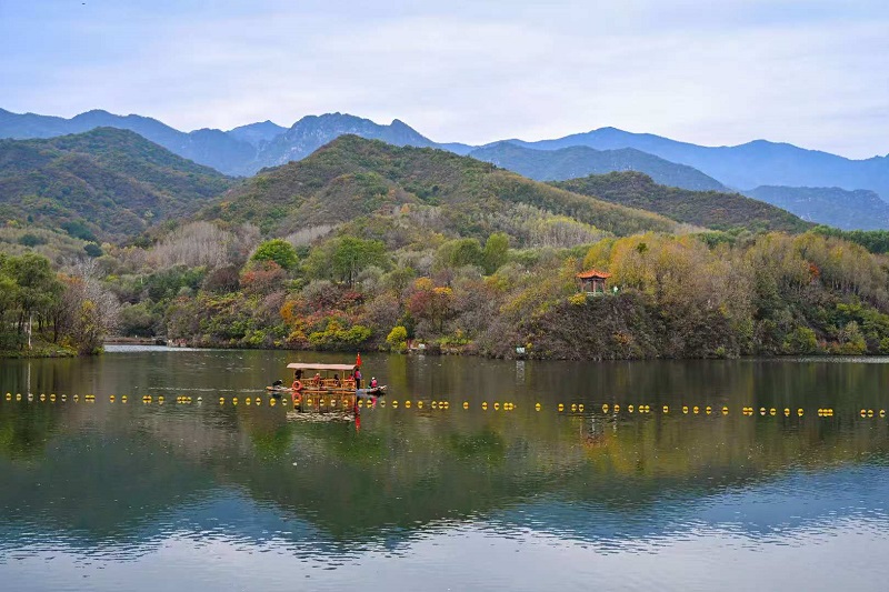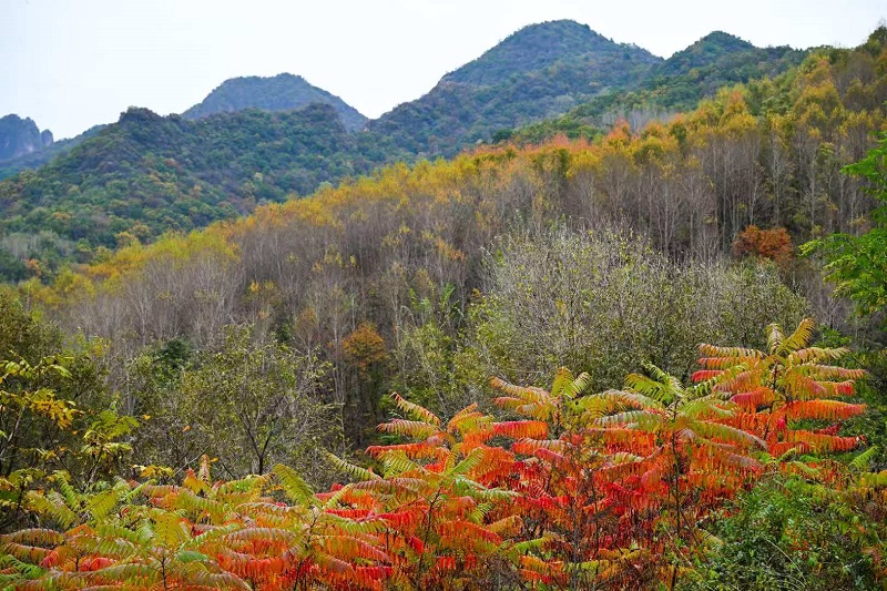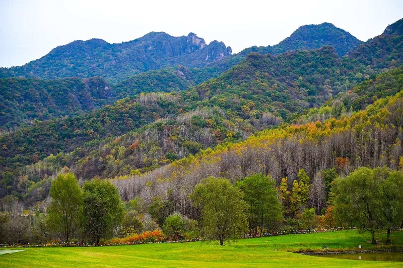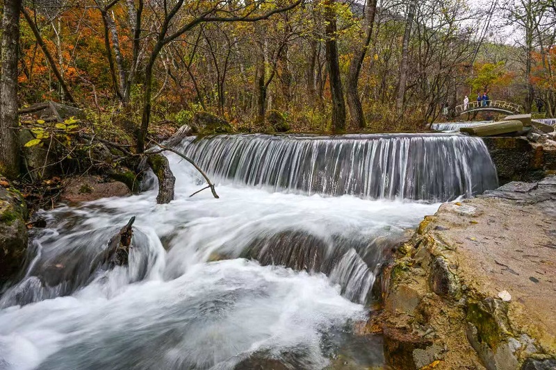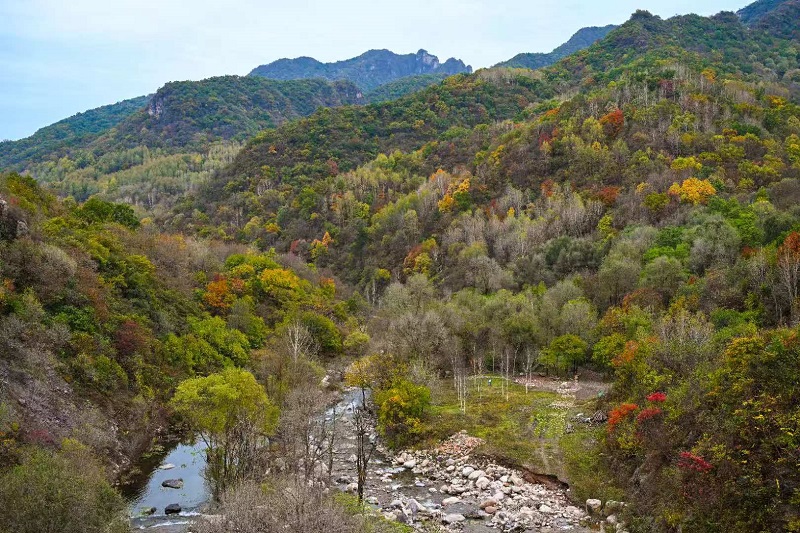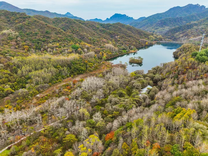 進入十月,玉渡山風景區已是層林盡染,山林色彩漸變交織,白樺樹的葉片變成了金黃色,落葉鋪滿了山間小路。在海拔1500米的森林裏,成片的紅葉為這幅秋日畫卷添上了迷人的色彩。山頂的草甸,視野開闊,遠處的群山連綿起伏,山上的樹木五彩斑斕。穿過山林,潺潺流水匯成碧綠的水潭,格外清澈,形成一幅“碧水映秋” 的絕美畫麵。