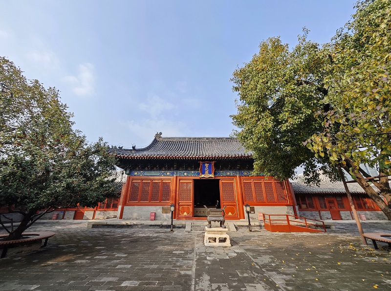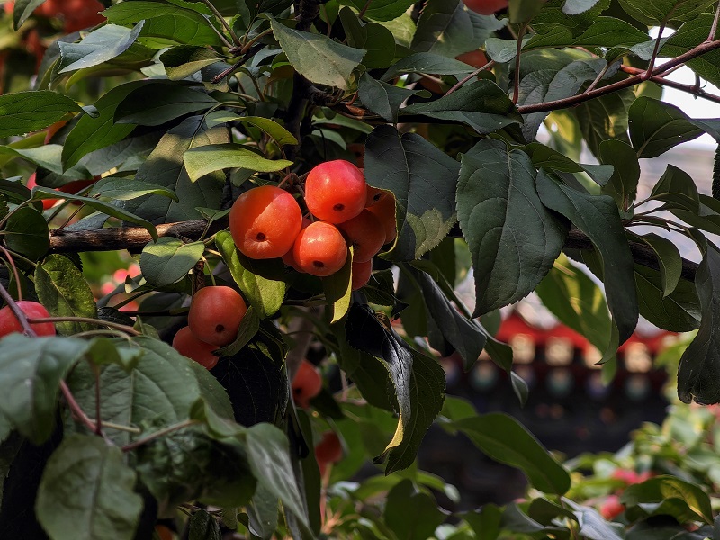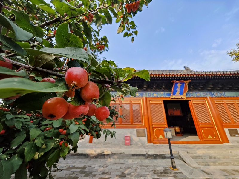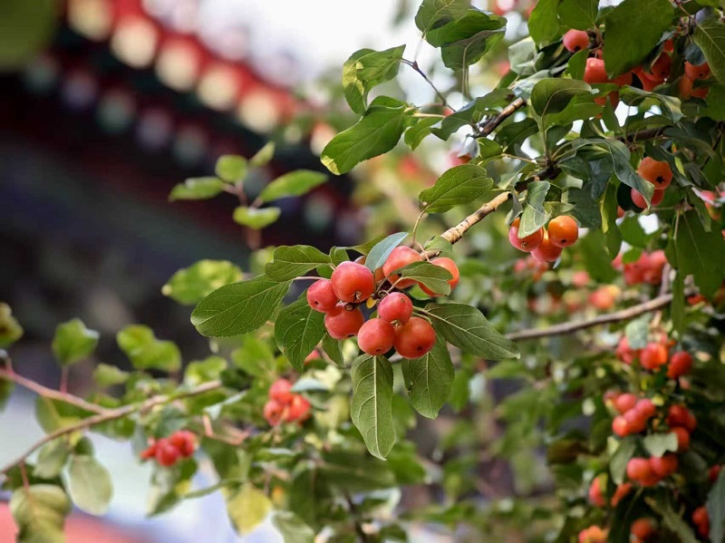 秋意已深,北京智化寺內,一抹豔麗的紅點亮了古老寺廟。在古寺一隅,一株百年海棠樹枝頭掛滿紅彤彤的果實,像繁星般閃耀,為寧靜的古寺添了幾分絢麗。