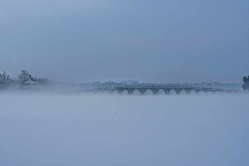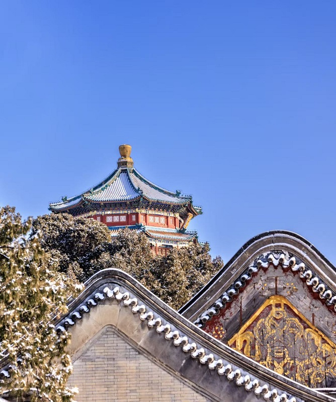 當紛紛揚揚的雪花覆上昆明湖的波光,當十七孔橋的獅首悄然披上銀甲,當佛香閣的琉璃瓦在雪色中泛起冷冽的青輝……