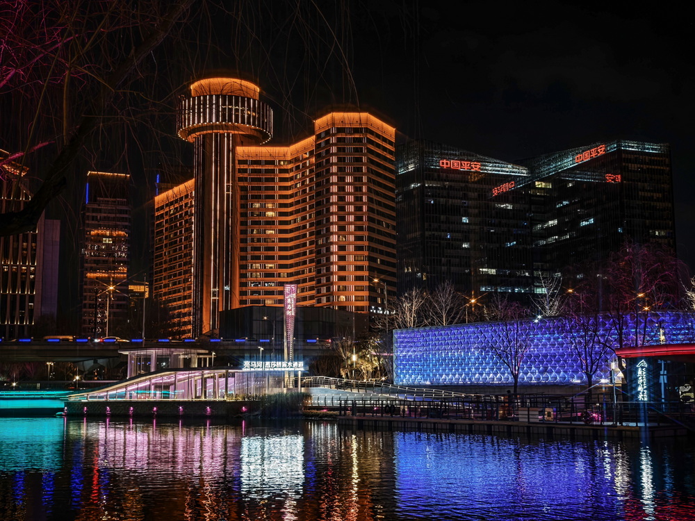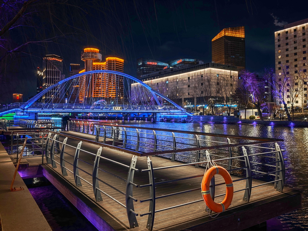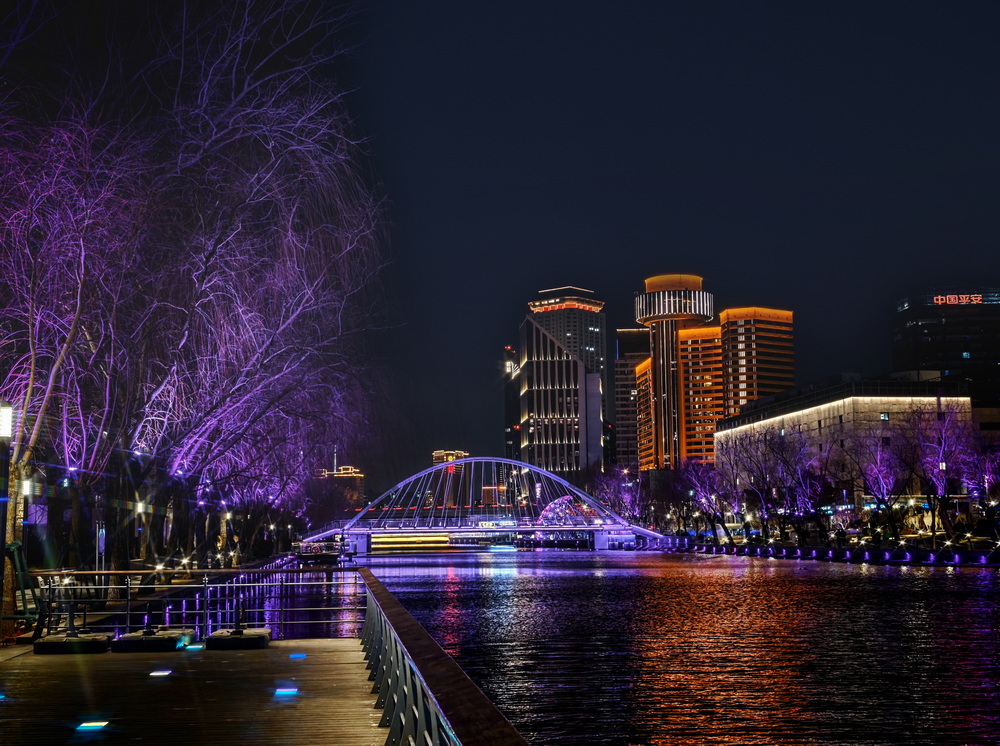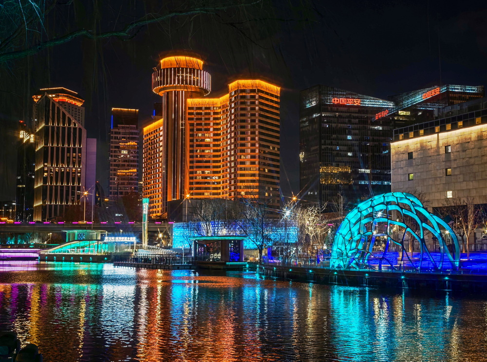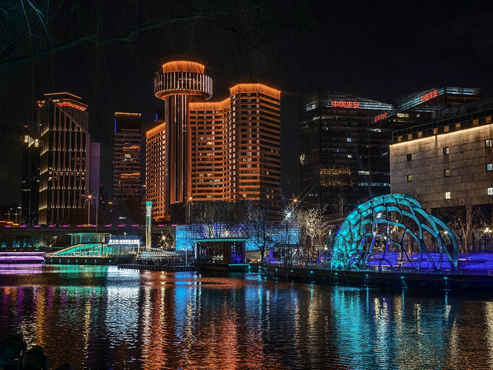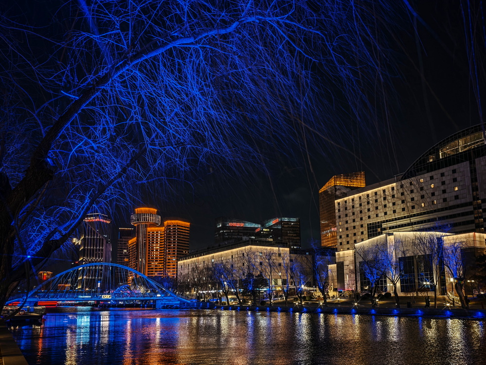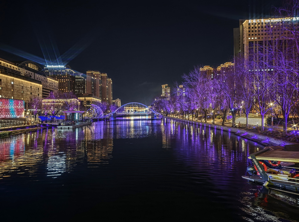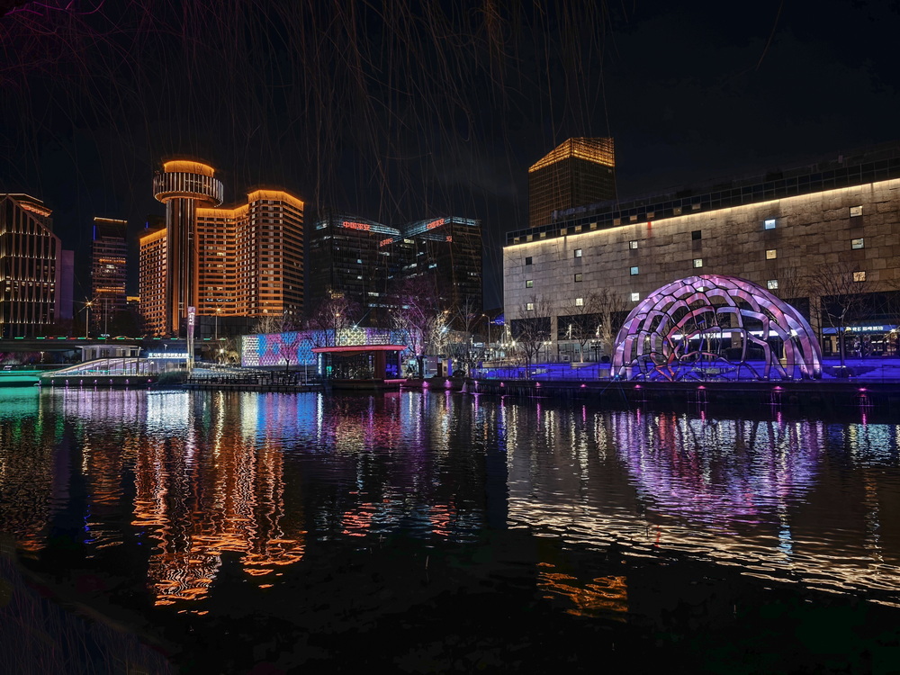 冬夜的風裹著涼意掠過亮馬河,卻吹不滅滿河的璀璨。岸邊的燈帶似凝固的星河,沿著河道蜿蜒舒展,暖黃與銀白交織著,把周邊建築的輪廓暈成朦朧的剪影。偶爾有行人裹緊圍巾駐足,手機鏡頭對準河麵,想留住這冬夜獨有的光影。