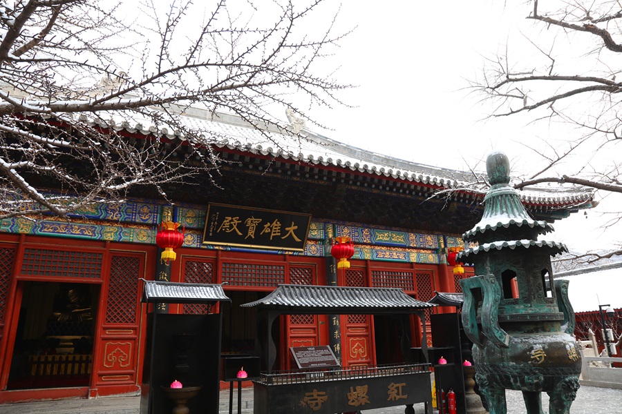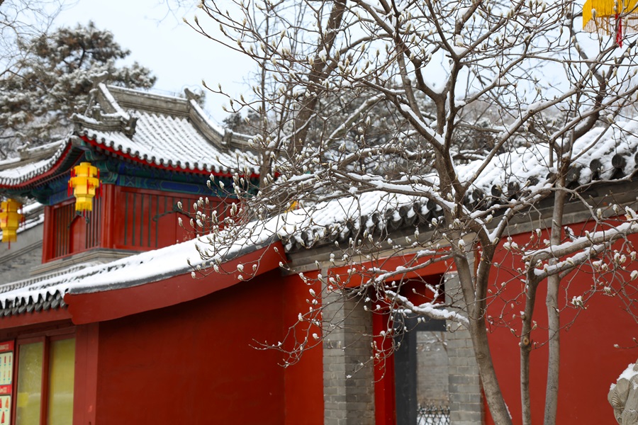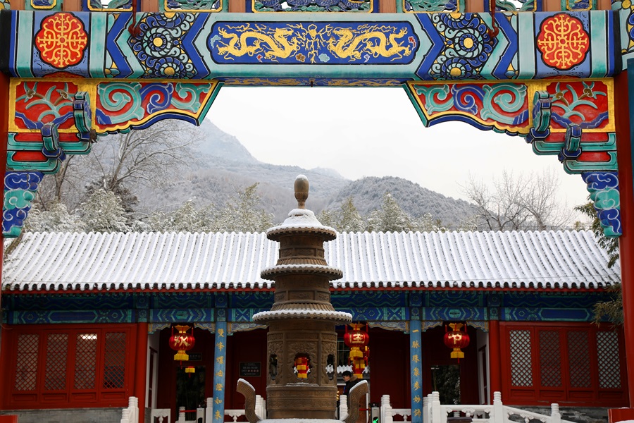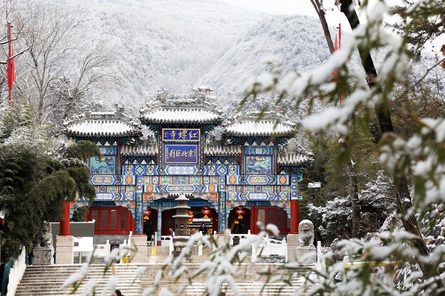 懷柔喜迎馬年初雪。千年古刹紅螺寺在漫天飛舞的雪花中銀裝素裹,呈現出“深山藏古寺,白雪映朱紅”的絕美畫卷。