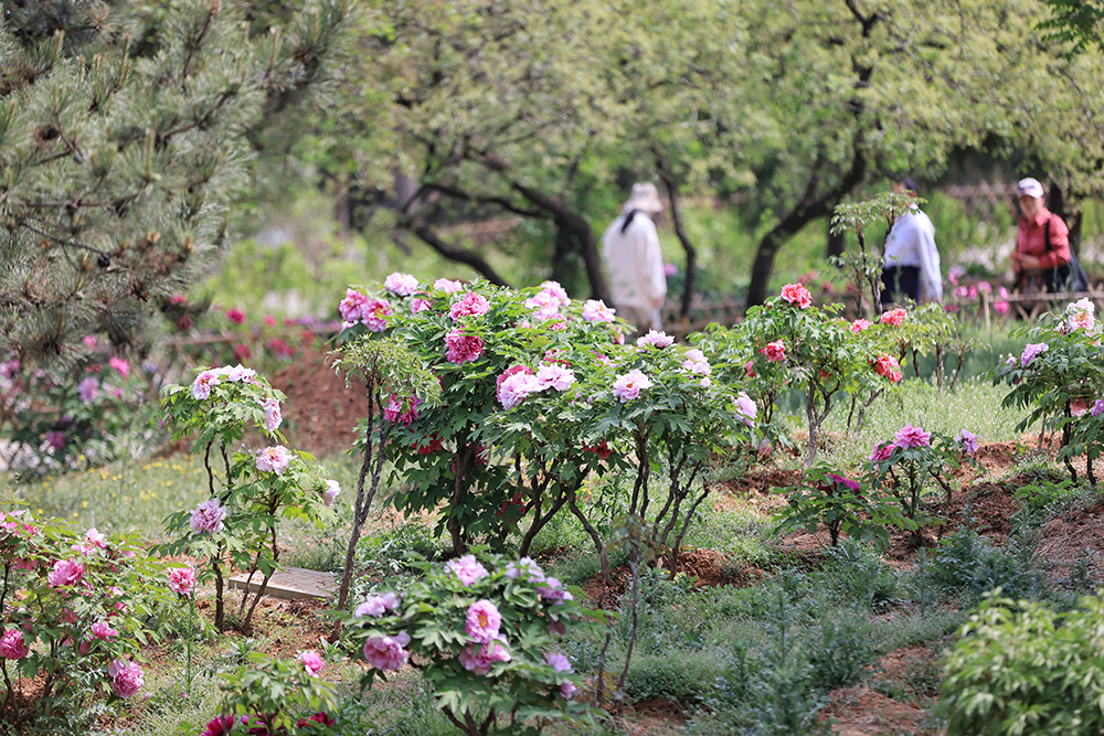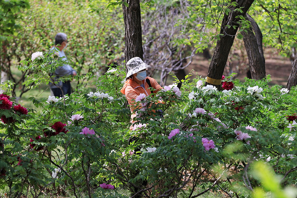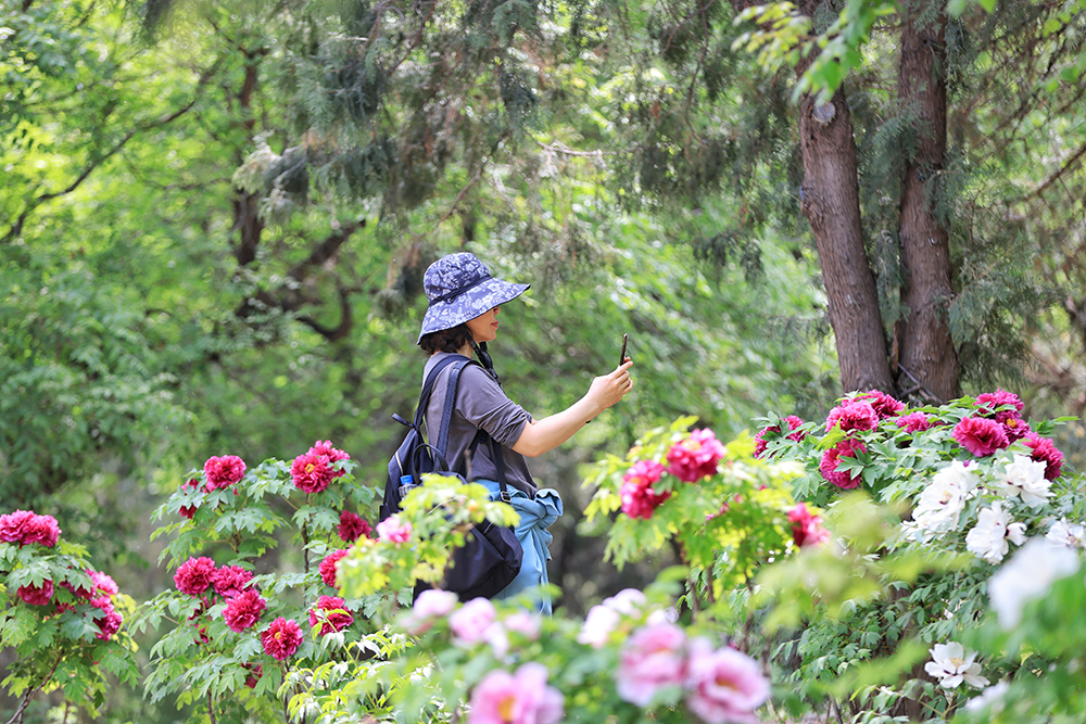北京西山國家森林公園的牡丹園花團錦簇,不少遊客到此打卡,拍攝。據了解,這裏牡丹品種有202個,牡丹有數千年的自然生長和兩千多年的人工栽培曆史,被稱為百花之王。西山國家森林公園的牡丹園占地約40畝,采用自然式布置手法,結合起伏的地形和油鬆等植被和諧地配置在一起,達到“雖由人作,宛自天開”的藝術效果。