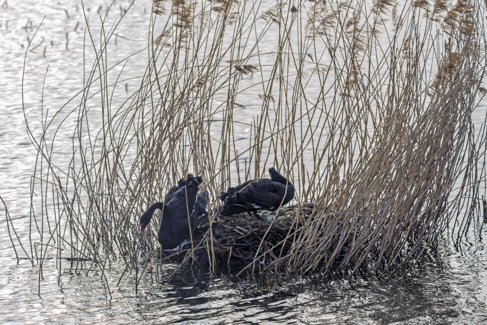黑天鵝夫婦正在巢穴中輪流孵化。