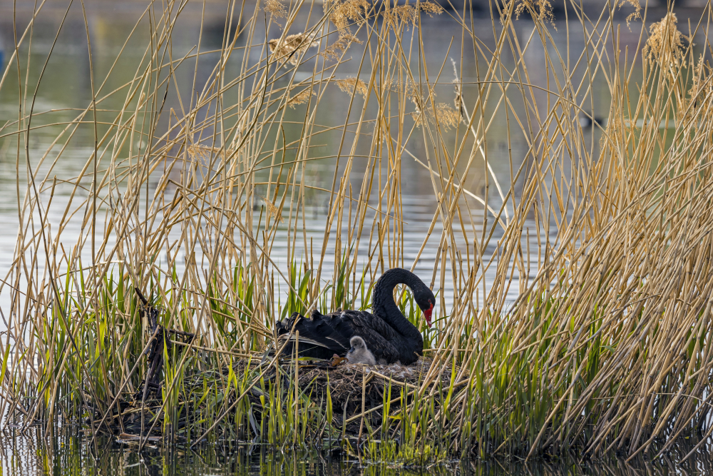 落戶懷柔,黑天鵝正在巢穴中嗬護自己的寶寶。