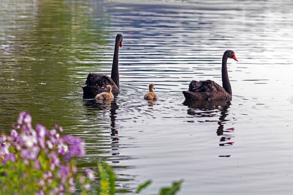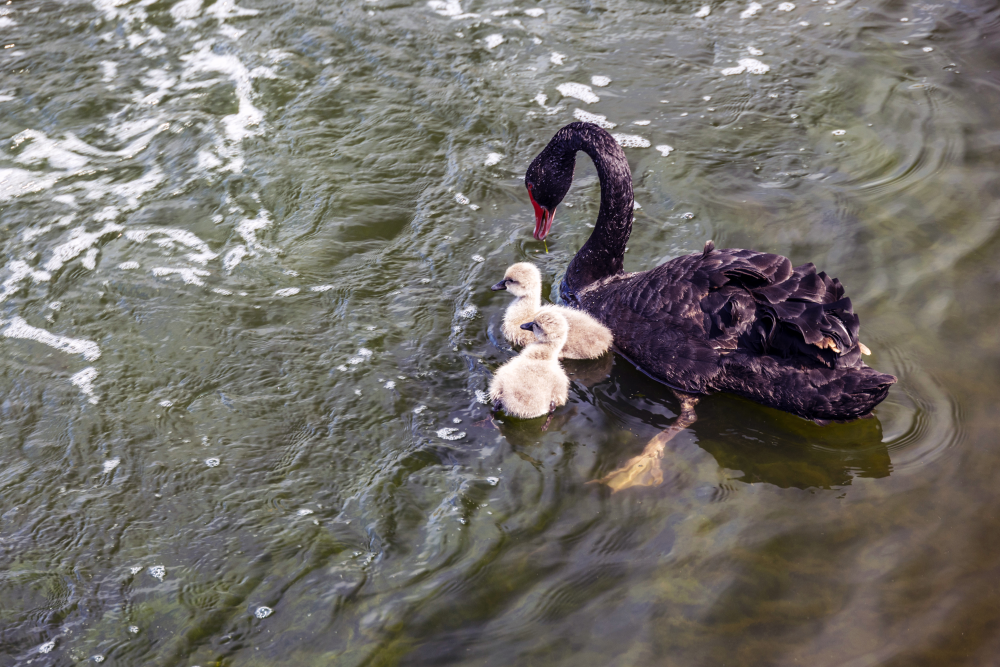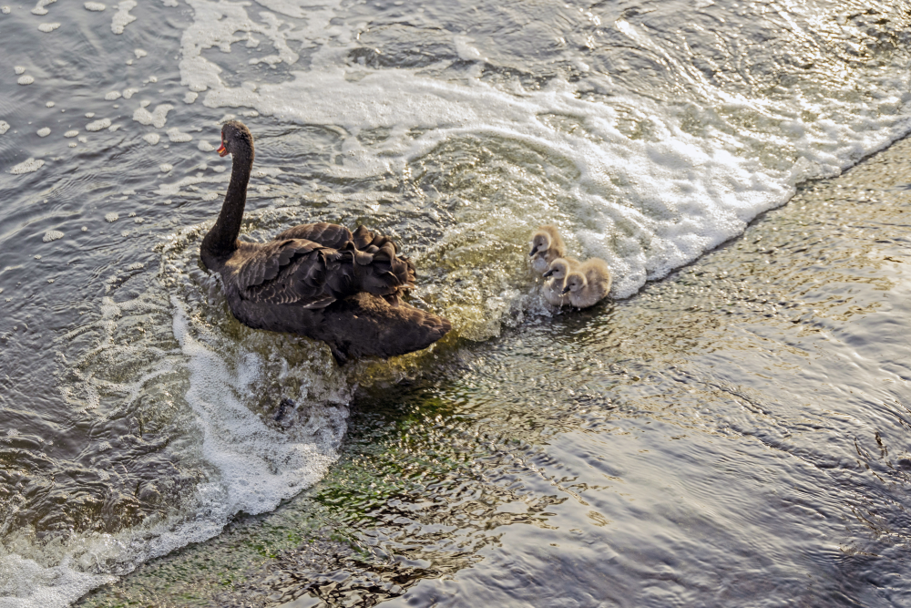 黑天鵝夫婦和小鵝在水中嬉戲,波光粼粼。