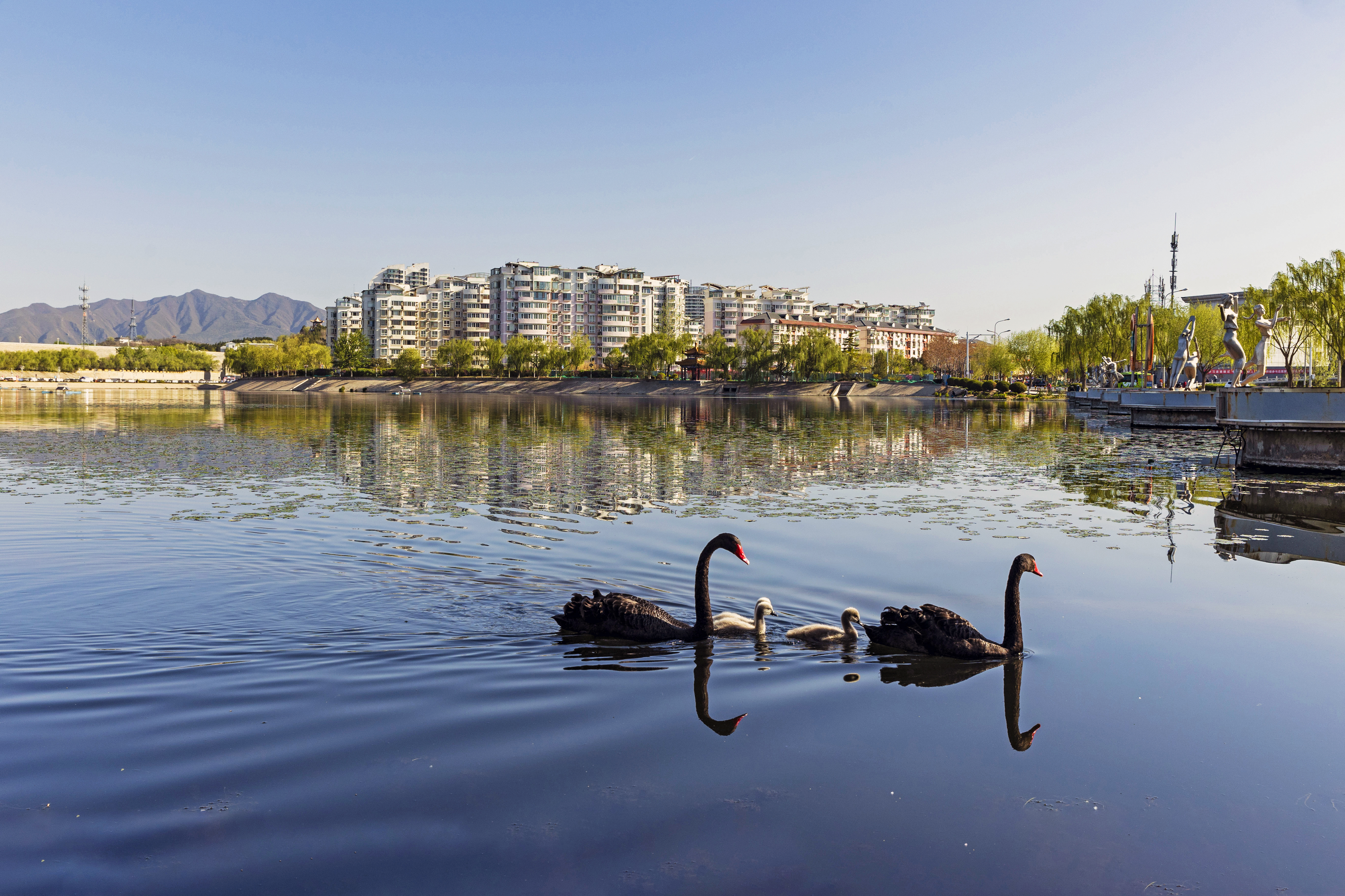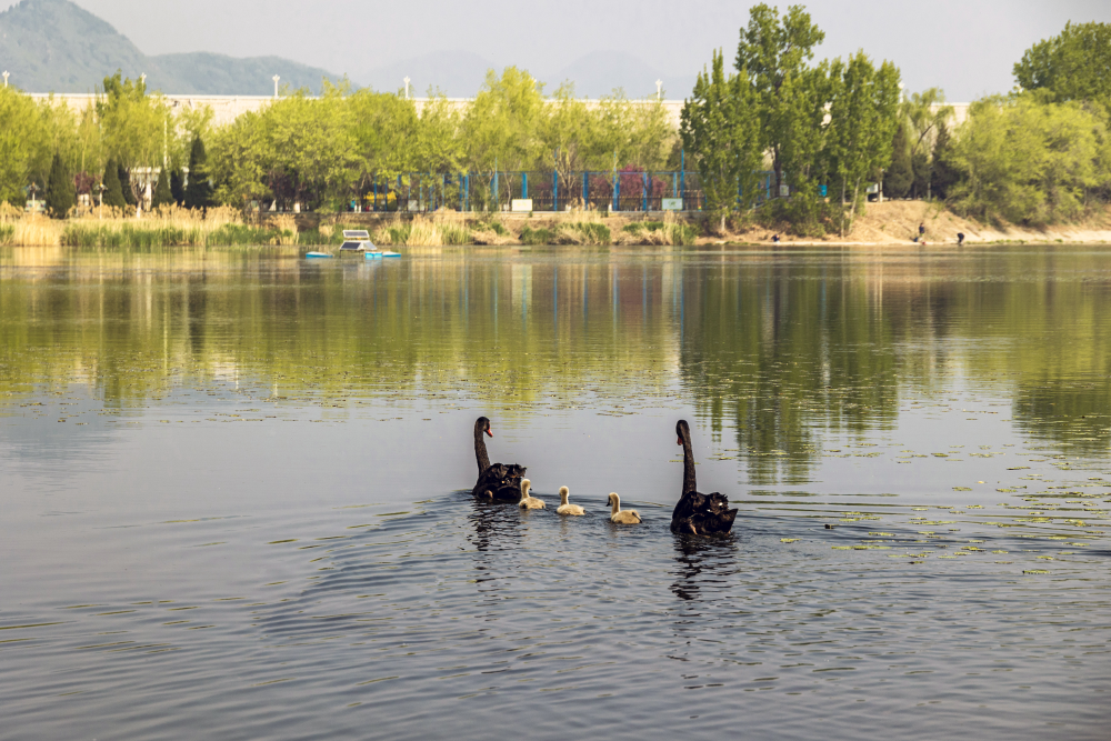 黑天鵝夫婦與小天鵝在水中自由遊弋,與遠處的城市風景形成一道亮麗的風景線。